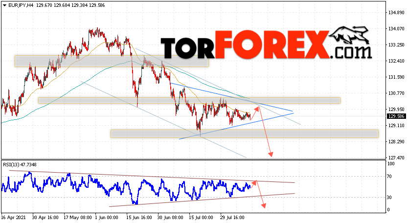 Таким образом, EUR/JPY прогноз Евро Иена на 13 августа 2021 предполагает развитие коррекции и тест области сопротивления на графике цены вблизи уровня 129.95. Откуда стоит ожидать отскок и попытку продолжения падения пары в область ниже уровня 127.45. В пользу снижения валютной пары выступит тест линии тренда на индикаторе относительной силы (RSI). Отменой варианта падения валютной пары EUR/JPY станет сильный рост котировок и пробой уровня 130.25. Это укажет на пробой области сопротивления и продолжение подъёма валютной пары на Форекс в область выше уровня 132.35.