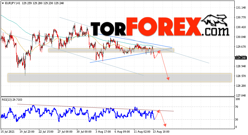 Таким образом, EUR/JPY прогноз Евро Иена на 16 августа 2021 предполагает развитие коррекции и тест области сопротивления на графике цены вблизи уровня 129.75. Откуда стоит ожидать отскок и попытку продолжения падения пары в область ниже уровня 127.65. В пользу снижения валютной пары выступит тест линии тренда на индикаторе относительной силы (RSI). Отменой варианта падения валютной пары EUR/JPY станет сильный рост котировок и пробой уровня 130.05. Это укажет на пробой области сопротивления и продолжение подъёма валютной пары на Форекс в область выше уровня 132.05.