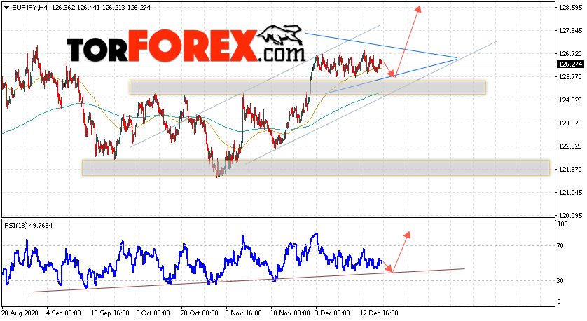 Таким образом, EUR/JPY прогноз Евро Иена на 28 декабря 2020 предполагает развитие коррекции и тест области поддержки на графике цены вблизи уровня 125.80. Откуда стоит ожидать отскок и попытку продолжения роста пары в область выше уровня 128.60. В пользу подъёма валютной пары выступит тест линии тренда на индикаторе относительной силы (RSI). Отменой варианта роста валютной пары EUR/JPY станет падение котировок и пробой уровня 124.95. Это укажет на пробой области поддержки и продолжение падения валютной пары на Форекс в область ниже уровня 122.85.
