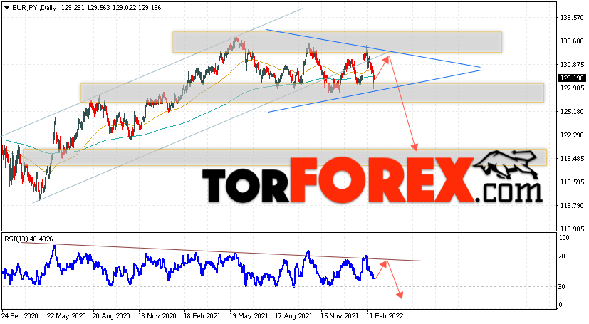 Дополнительным сигналом в пользу падения валютной пары Доллар Франк выступит тест линии тренда на индикаторе относительной силы. Вторым сигналом станет отскок от нижней границы бычьего канала, который был пробит вниз. Отменой варианта падения EUR/JPY станет сильный рост цены и пробой области 134.05. Это укажет на пробой области сопротивления и продолжение роста пары на Форекс с целью выше области 137.05. Подтверждением падения пары на текущей торговой неделе 28 февраля — 4 марта 2022 выступит пробой области поддержки и закрытие котировок ниже уровня 126.05, что укажет на пробой нижней границы модели ”Треугольник”.