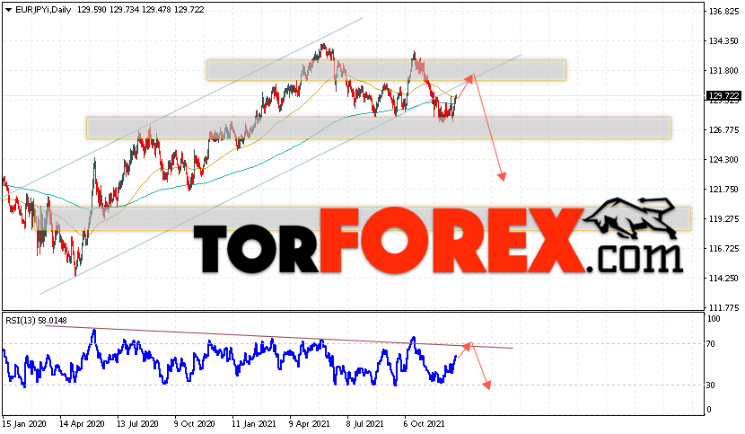 Дополнительным сигналом в пользу падения валютной пары Доллар Франк выступит тест линии тренда на индикаторе относительной силы. Вторым сигналом станет отскок от нижней границы бычьего канала, который был пробит медведями вниз. Отменой варианта падения EUR/JPY станет сильный рост цены и пробой области 134.05. Это укажет на пробой области сопротивления и продолжение роста пары на Форекс с целью выше области 137.05. Подтверждением падения пары на текущей торговой неделе 27 — 31 декабря 2021 выступит пробой области поддержки и закрытие котировок ниже уровня 126.55.