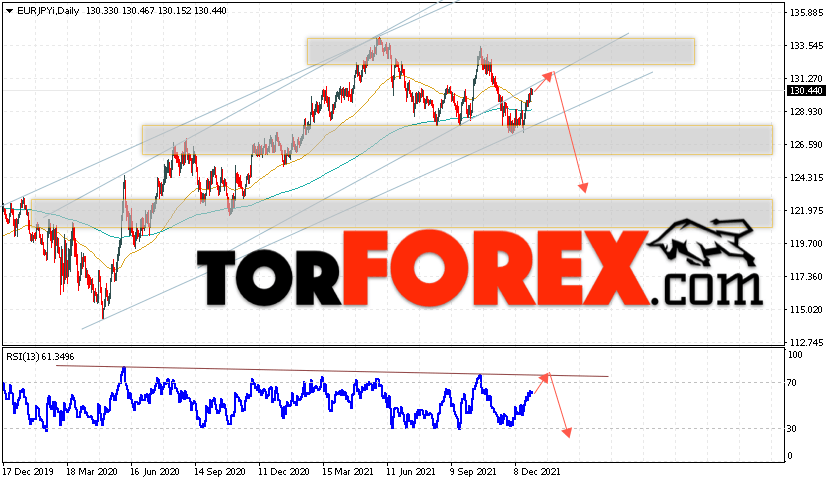 Дополнительным сигналом в пользу падения валютной пары Доллар Франк выступит тест линии тренда на индикаторе относительной силы. Вторым сигналом станет отскок от нижней границы бычьего канала. Отменой варианта падения EUR/JPY станет сильный рост цены и пробой области 134.05. Это укажет на пробой области сопротивления и продолжение роста пары на Форекс с целью выше области 137.25. Подтверждением падения пары на текущей торговой неделе 3 — 7 января 2022 выступит пробой области поддержки и закрытие котировок ниже уровня 126.55.