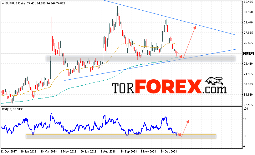 Таким образом, EUR/RUB прогноз Евро Рубль 28 января — 1 февраля 2019 предполагает попытку теста уровня поддержки вблизи области 74.65. Откуда стоит ожидать отскок и продолжения роста курса Евро против Рубля с целью выше уровня 78.25. Дополнительным сигналом в пользу подъёма пары выступит тест линии тренда на индикаторе относительной силы. Отменой варианта роста станет пробой нижней границы модели «Треугольник» и закрытие котировок ниже уровня 73.45.