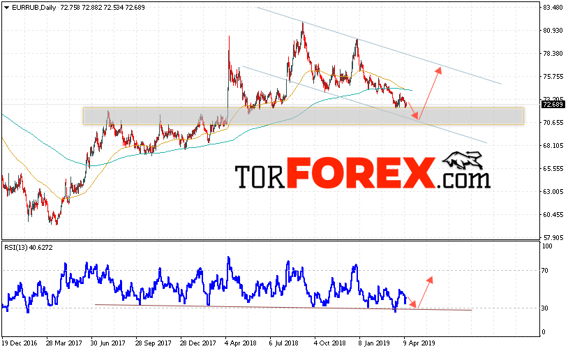 Таким образом, EUR/RUB прогноз Евро Рубль на неделю 15 — 19 апреля 2019 предполагает попытку теста уровня поддержки вблизи области 70.65. Откуда стоит ожидать отскок и продолжения роста курса Евро против Рубля с целью выше уровня 76.35. Дополнительным сигналом в пользу подъёма пары выступит тест линии тренда на индикаторе относительной силы. Отменой варианта роста станет пробой нижней границы модели и закрытие котировок ниже уровня 69.50.