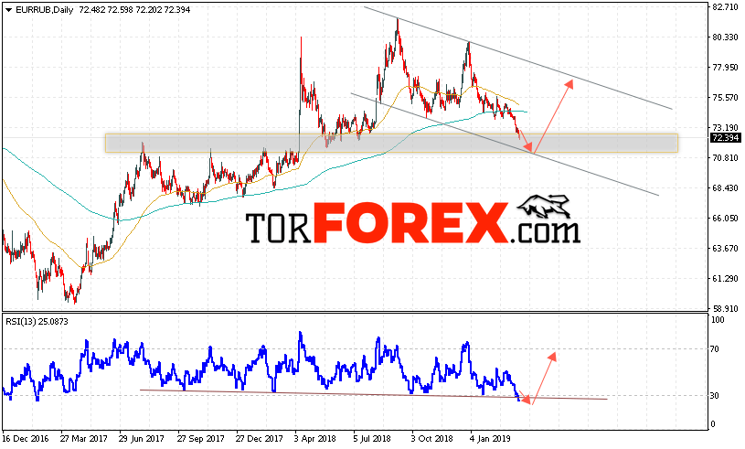 Таким образом, EUR/RUB прогноз Евро Рубль на неделю 25 — 29 марта 2019 предполагает попытку теста уровня поддержки вблизи области 70.85. Откуда стоит ожидать отскок и продолжения роста курса Евро против Рубля с целью выше уровня 76.55. Дополнительным сигналом в пользу подъёма пары выступит тест линии тренда на индикаторе относительной силы. Отменой варианта роста станет пробой нижней границы модели и закрытие котировок ниже уровня 66.55.