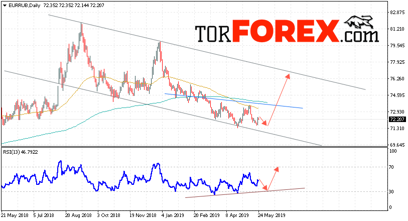 Таким образом, EUR/RUB прогноз Евро Рубль на неделю 27 — 31 мая 2019 предполагает попытку теста уровня поддержки вблизи области 71.85. Откуда стоит ожидать отскок и продолжения роста курса Евро против Рубля с целью выше уровня 76.55. Дополнительным сигналом в пользу подъёма пары выступит тест линии тренда на индикаторе относительной силы. Отменой варианта роста станет пробой нижней границы модели и закрытие котировок ниже уровня 69.45.