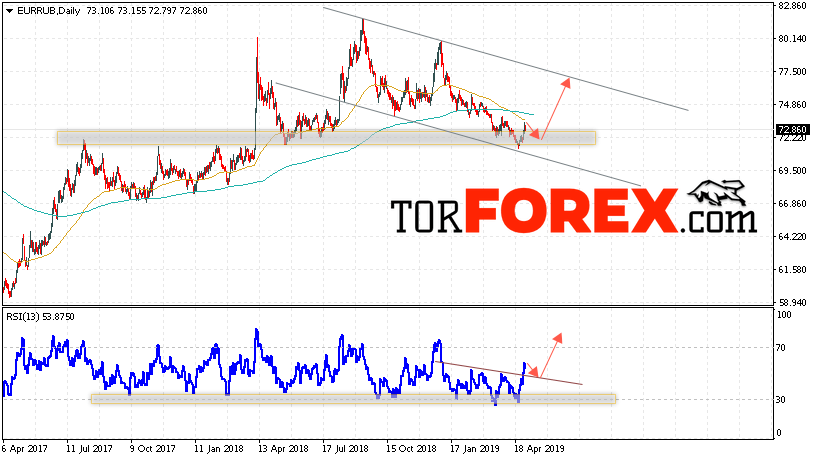 Таким образом, EUR/RUB прогноз Евро Рубль на неделю 6 — 10 мая 2019 предполагает попытку теста уровня поддержки вблизи области 72.25. Откуда стоит ожидать отскок и продолжения роста курса Евро против Рубля с целью выше уровня 76.65. Дополнительным сигналом в пользу подъёма пары выступит тест линии тренда на индикаторе относительной силы. Отменой варианта роста станет пробой нижней границы модели и закрытие котировок ниже уровня 68.45.