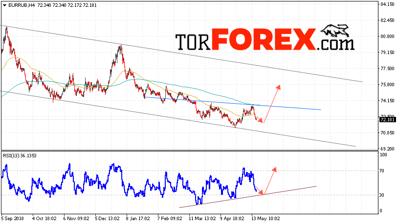 Дополнительным сигнальном в пользу роста пары EUR/RUB выступит тест восходящей линии тренда на индикаторе относительной силы (RSI). Вторым сигнальном станет формирования разворотной модели. Отменой варианта роста пары EUR/RUB на Форекс станет падение и пробой уровня 70.95 Евро за Рубль. Это укажет на пробой области поддержки и продолжение падения пары Евро Рубль в область ниже уровня 69.45. Подтверждением подъёма валютной пары выступит пробой области сопротивления и закрытие выше уровня 73.95.