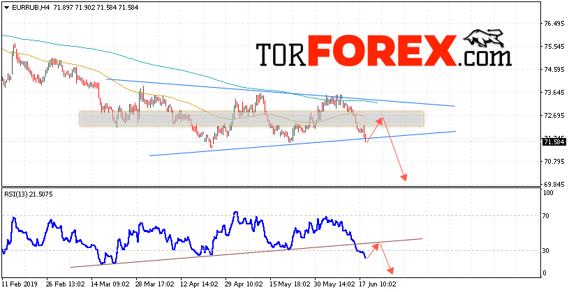 Таким образом, EUR/RUB прогноз курса Евро на 19 июня 2019 предполагает попытку теста уровня сопротивления вблизи области 72.65. Откуда стоит ожидать отскок и продолжения падения курса Евро против Рубля с целью ниже уровня 69.85. Дополнительным сигналом в пользу снижения пары выступит тест линии тренда на индикаторе относительной силы. Отменой варианта падения станет пробой области сопротивления и закрытие котировок выше уровня 73.65. В этом случае стоит ожидать продолжения роста с целью выше области 75.55.