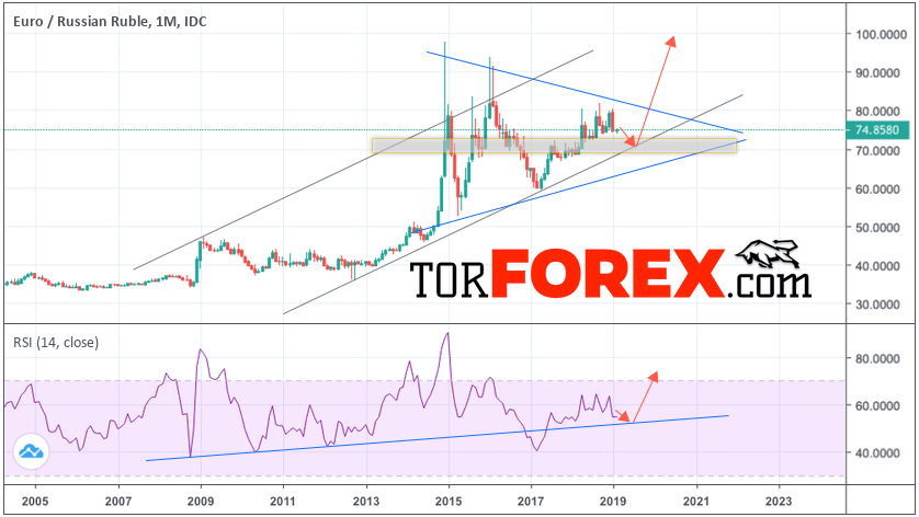 Таким образом, EUR/RUB прогноз курса Евро на 2019 год предполагает попытку теста уровня поддержки вблизи области 72.00. Откуда стоит ожидать отскок и продолжения роста курса Евро против Рубля с целью выше уровня 100.00. Дополнительным сигналом в пользу подъёма пары выступит тест линии тренда на индикаторе относительной силы. Отменой варианта роста станет пробой области поддержки и закрытие котировок ниже уровня 67.55.