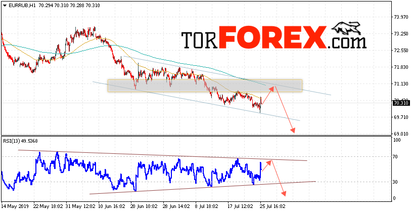Дополнительным сигнальном в пользу падения пары EUR/RUB выступит тест нисходящей линии на индикаторе относительной силы. Вторым сигналом станет отскок от верхней границы нисходящего канала. Отменой варианта падения пары EUR/RUB на Форекс 26 июля 2019 станет сильный рост и пробой уровня 71.65 Евро за Рубль. Это укажет на пробой области сопротивления и продолжение роста пары Евро Рубль в область выше уровня 73.35. Подтверждением падения валютной пары выступит пробой области поддержки и закрытие ниже уровня 69.60.