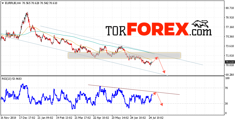 Дополнительным сигнальном в пользу падения пары EUR/RUB выступит тест нисходящей линии тренда на индикаторе относительной силы. Вторым сигналом станет отскок от верхней границы нисходящего канала. Отменой варианта падения пары EUR/RUB на Форекс 30 июля 2019 станет сильный рост и пробой уровня 71.65 Евро за Рубль. Это укажет на пробой области сопротивления и продолжение роста пары Евро Рубль в область выше уровня 73.35. Подтверждением падения валютной пары выступит пробой области поддержки и закрытие ниже уровня 69.80.