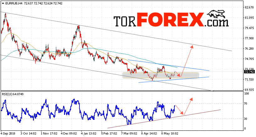 Дополнительным сигнальном в пользу роста пары EUR/RUB выступит тест восходящей линии тренда на индикаторе относительной силы. Вторым сигнальном станет отскок от нижней границы модели «Треугольник». Отменой варианта роста пары EUR/RUB на Форекс станет падение и пробой уровня 70.95 Евро за Рубль. Это укажет на пробой области поддержки и продолжение падения пары Евро Рубль в область ниже уровня 69.35. Подтверждением подъёма валютной пары выступит пробой области сопротивления и закрытие выше уровня 73.55.