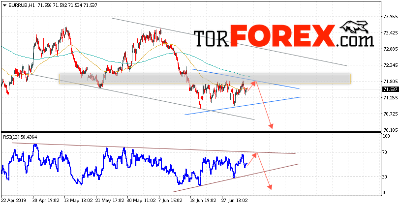 Дополнительным сигнальном в пользу падения пары EUR/RUB выступит тест нисходящей линии на индикаторе относительной силы. Вторым сигналом станет отскок от верхней границы модели «Треугольник». Отменой варианта падения пары EUR/RUB на Форекс 5 июля 2019 станет сильный рост и пробой уровня 72.35 Евро за Рубль. Это укажет на пробой области сопротивления и продолжение роста пары Евро Рубль в область выше уровня 74.85. Подтверждением падения валютной пары выступит пробой области поддержки и закрытие ниже уровня 70.60.