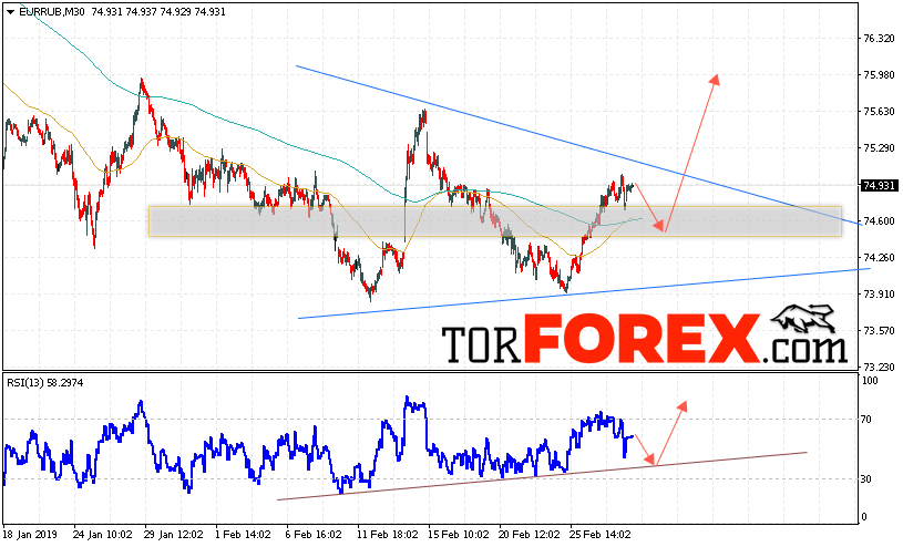 Таким образом, EUR/RUB прогноз курса Евро Рубль на 1 марта 2019 предполагает попытку теста уровня поддержки вблизи области 74.45. Откуда стоит ожидать отскок и продолжения роста курса Евро против Рубля с целью выше уровня 75.95. Дополнительным сигналом в пользу подъёма пары выступит тест линии тренда на индикаторе относительной силы. Отменой варианта роста станет пробой области поддержки и закрытие котировок ниже уровня 73.85.