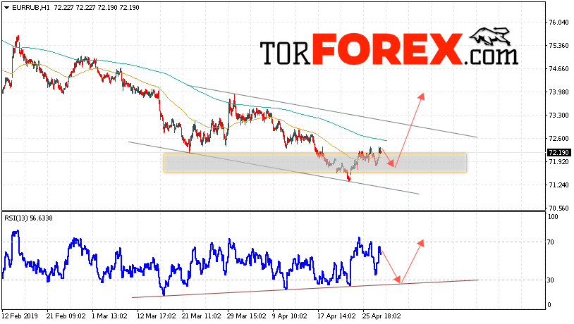 Таким образом, EUR/RUB прогноз курса Евро Рубль на 1 мая 2019 предполагает попытку теста уровня поддержки вблизи области 71.75. Откуда стоит ожидать отскок и продолжения роста курса Евро против Рубля с целью выше уровня 74.00. Дополнительным сигналом в пользу роста пары выступит тест линии тренда на индикаторе относительной силы. Отменой варианта подъёма станет пробой области поддержки и закрытие котировок ниже уровня 70.85.