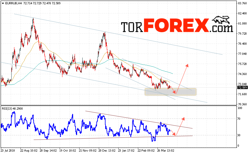 Таким образом, EUR/RUB прогноз курса Евро Рубль на 16 апреля 2019 предполагает попытку теста уровня поддержки вблизи области 71.65. Откуда стоит ожидать отскок и продолжения роста курса Евро против Рубля с целью выше уровня 75.70. Дополнительным сигналом в пользу подъёма пары выступит тест линии тренда на индикаторе относительной силы. Отменой варианта роста станет пробой области поддержки и закрытие котировок ниже уровня 70.45.