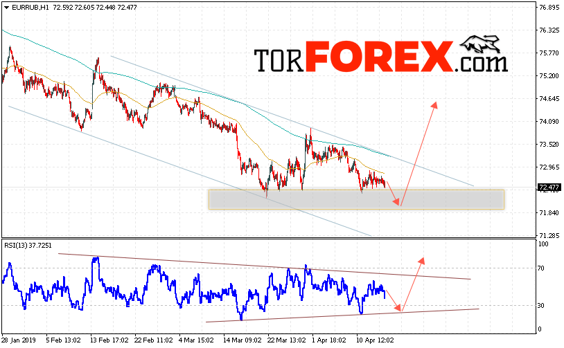 Таким образом, EUR/RUB прогноз курса Евро Рубль на 17 апреля 2019 предполагает попытку теста уровня поддержки вблизи области 71.90. Откуда стоит ожидать отскок и продолжения роста курса Евро против Рубля с целью выше уровня 74.65. Дополнительным сигналом в пользу подъёма пары выступит тест линии тренда на индикаторе относительной силы. Отменой варианта роста станет пробой области поддержки и закрытие котировок ниже уровня 71.45.