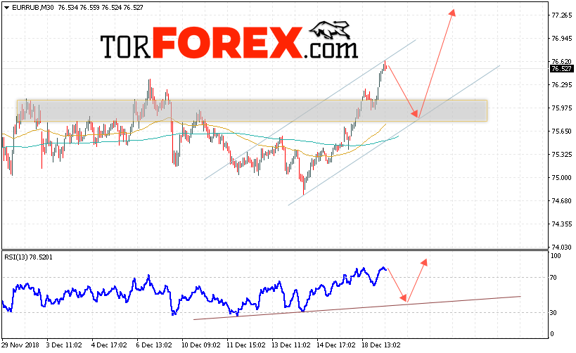 Таким образом, EUR/RUB прогноз курса Евро Рубль на 20 декабря 2018 предполагает попытку теста уровня поддержки вблизи области 75.80. Откуда стоит ожидать отскок и продолжения роста курса Евро против Рубля с целью выше уровня 77.25. Дополнительным сигналом в пользу роста пары выступит тест линии тренда на индикаторе относительной силы. Отменой варианта подъёма станет пробой области поддержки и закрытие котировок ниже уровня 75.55.