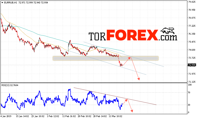 Таким образом, EUR/RUB прогноз курса Евро Рубль на 20 марта 2019 предполагает попытку теста уровня сопротивления вблизи области 73.70. Откуда стоит ожидать отскок и продолжения падения курса Евро против Рубля с целью ниже уровня 71.15. Дополнительным сигналом в пользу снижения пары выступит тест линии тренда на индикаторе относительной силы. Отменой варианта падения станет пробой области сопротивления и закрытие котировок выше уровня 74.05.