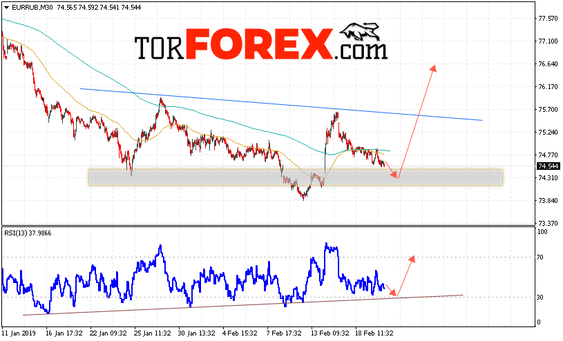 Таким образом, EUR/RUB прогноз курса Евро Рубль на 21 февраля 2019 предполагает попытку теста уровня поддержки вблизи области 74.35. Откуда стоит ожидать отскок и продолжения роста курса Евро против Рубля с целью выше уровня 76.65. Дополнительным сигналом в пользу подъёма пары выступит тест линии тренда на индикаторе относительной силы. Отменой варианта роста станет пробой области поддержки и закрытие котировок ниже уровня 73.45.