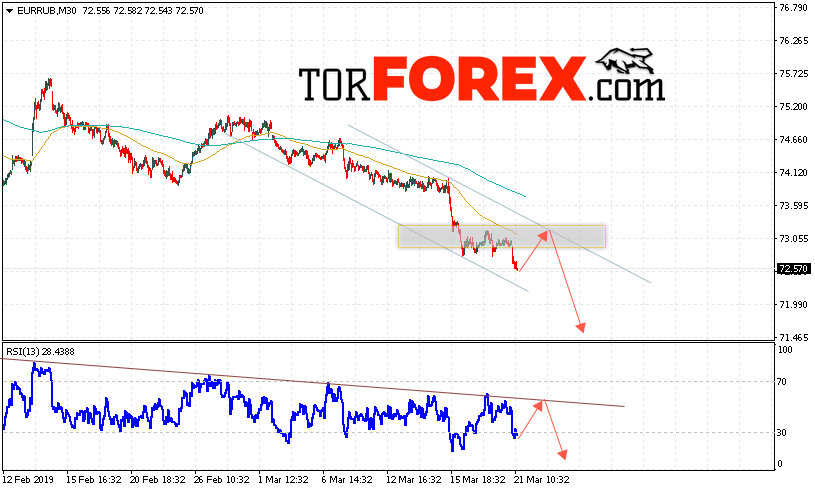 Таким образом, EUR/RUB прогноз курса Евро Рубль на 22 марта 2019 предполагает попытку теста уровня сопротивления вблизи области 73.10. Откуда стоит ожидать отскок и продолжения падения курса Евро против Рубля с целью ниже уровня 71.45. Дополнительным сигналом в пользу снижения пары выступит тест линии тренда на индикаторе относительной силы. Отменой варианта падения станет пробой области сопротивления и закрытие котировок выше уровня 74.05.