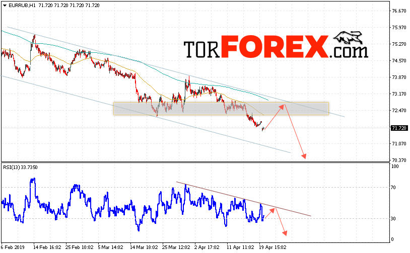 Таким образом, EUR/RUB прогноз курса Евро Рубль на 23 апреля 2019 предполагает попытку теста уровня сопротивления вблизи области 71.55. Откуда стоит ожидать отскок и продолжения падения курса Евро против Рубля с целью выше уровня 70.35. Дополнительным сигналом в пользу падения пары выступит тест линии тренда на индикаторе относительной силы. Отменой варианта снижения станет пробой области сопротивления и закрытие котировок выше уровня 73.35.
