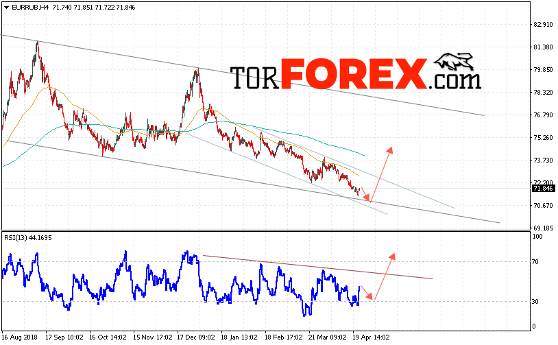 Таким образом, EUR/RUB прогноз курса Евро Рубль на 25 апреля 2019 предполагает попытку теста уровня поддержки вблизи области 70.85. Откуда стоит ожидать отскок и продолжения роста курса Евро против Рубля с целью выше уровня 74.25. Дополнительным сигналом в пользу роста пары выступит тест линии тренда на индикаторе относительной силы. Отменой варианта подъёма станет пробой области поддержки и закрытие котировок ниже уровня 70.05.