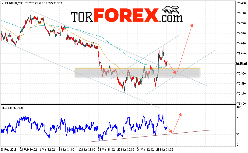Таким образом, EUR/RUB прогноз курса Евро Рубль на 3 апреля 2019 предполагает попытку теста уровня поддержки вблизи области 72.95. Откуда стоит ожидать отскок и продолжения роста курса Евро против Рубля с целью выше уровня 74.75. Дополнительным сигналом в пользу подъёма пары выступит тест линии тренда на индикаторе относительной силы. Отменой варианта роста станет пробой области поддержки и закрытие котировок ниже уровня 72.45.