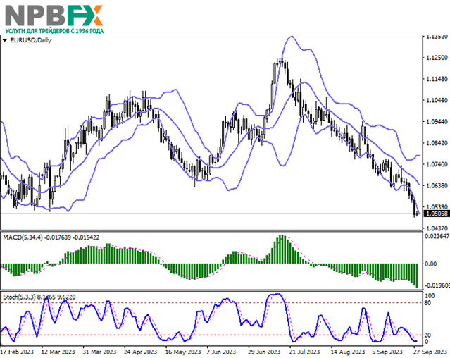 Полосы Боллинджера на дневном графике демонстрируют активное снижение: ценовой диапазон расширяется снизу, однако за всплеском «медвежьей» активности в настоящий момент не успевает. MACD снижается, сохраняя прочный сигнал на продажу (гистограмма располагается ниже сигнальной линии). Стохастик, достигнув своих минимальных значений, развернулся в горизонтальную плоскость, указывая на риски перепроданности единой валюты в сверхкраткосрочной перспективе.