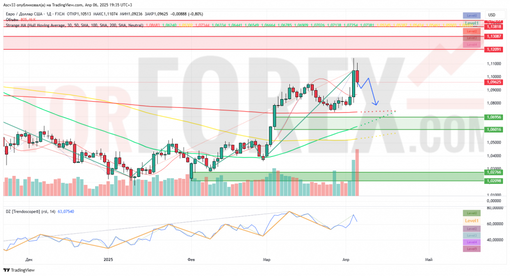 Пара EUR/USD показала резкий рост до уровня 1.1100, но на фоне перегретого RSI и значительного всплеска объёмов началась коррекция. Закрытие дня на отметке 1.0962 с «медвежьим поглощением» на дневной свече указывает на высокую вероятность отката в ближайшие торговые сессии.