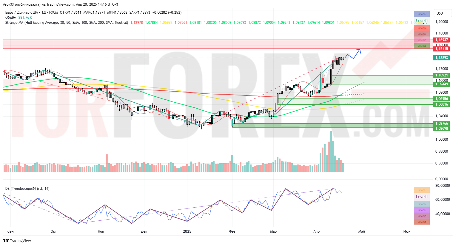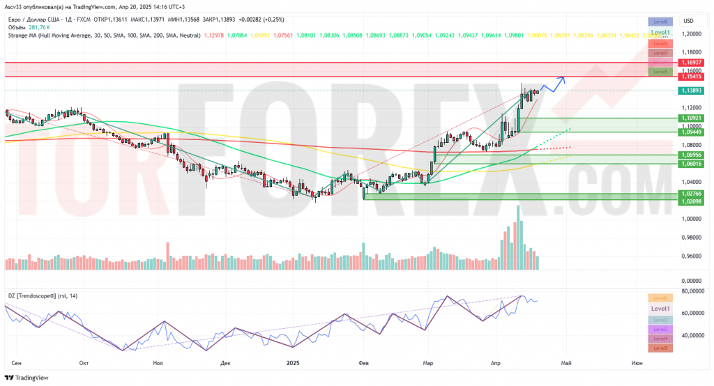 Торговая пара EUR/USD демонстрирует чётко выраженный восходящий тренд, подтверждённый пробоем сопротивлений и техническими индикаторами. В краткосрочной перспективе ожидается консолидация в диапазоне 1,1300 – 1,1540 с приоритетом на рост. Наиболее логичная торговая идея — искать покупки на откате в зоне 1,1300 – 1,1350 с целями на 1,1540 – 1,1600. Стоп-лосс целесообразно размещать ниже 1,1270, под последним импульсным минимумом.