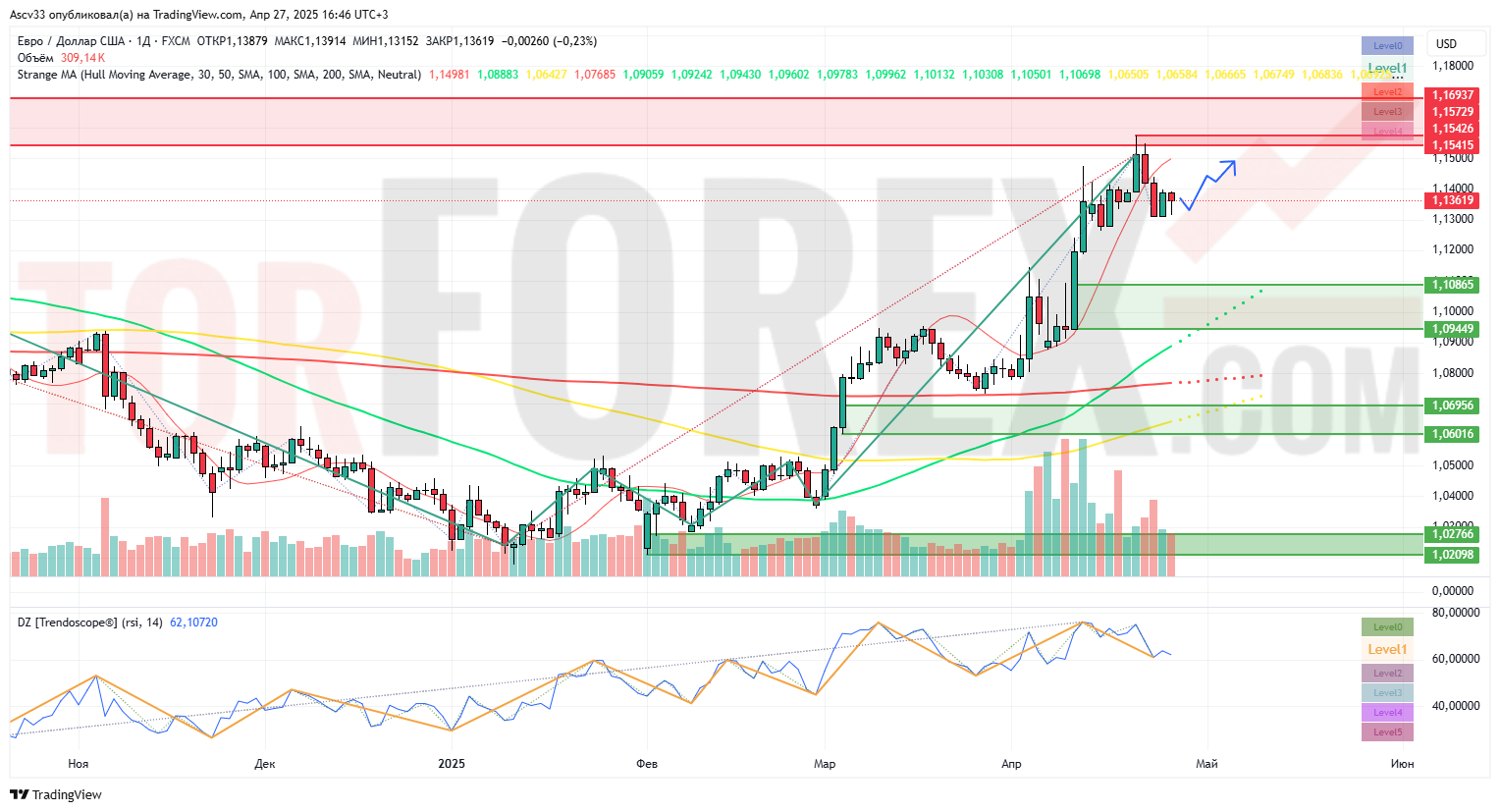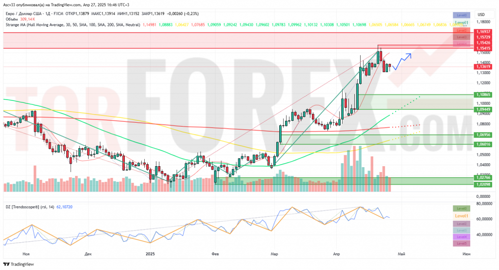 На дневном графике EUR/USD торгуется в районе 1,1361. Цена удерживается выше всех основных скользящих средних EMA 50, EMA 100 и EMA 200, что подтверждает наличие устойчивого восходящего тренда.
