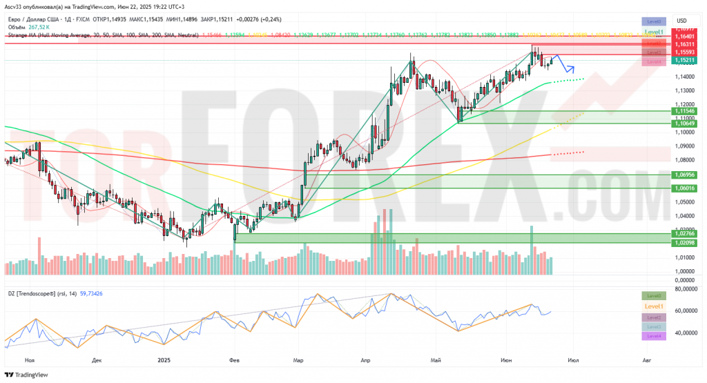 При сохранении давления от уровня 1,1550–1,1600 вероятно снижение к 1,1450 и далее к 1,1320. Это основной базовый сценарий на текущий момент.