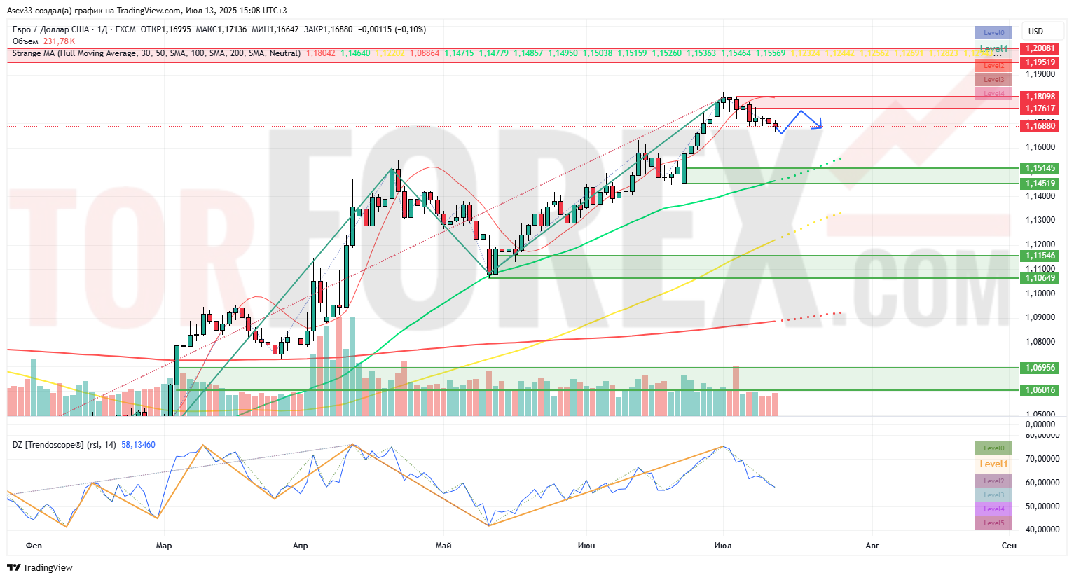 - EMA 50 (зелёная линия) продолжает устойчивый рост и находится ниже цены, выступая динамической поддержкой.