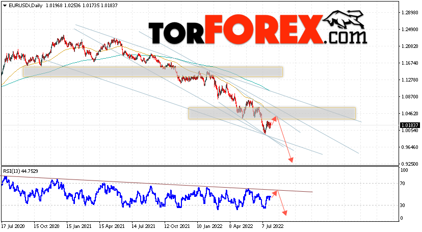 Таким образом, EUR/USD прогноз Евро Доллар на 1 — 5 августа 2022 предполагает попытку развития незначительной коррекции и тест области сопротивления вблизи уровня 1.0285. Откуда стоит ожидать продолжения падения пары на рынке Форекс в область ниже уровня 0.9265. Дополнительным сигналом в пользу снижения выступит тест линии сопротивления на индикаторе относительной силы, обратите внимание, что от неё уже было много отскоков и падений цены. Отменой варианта падения Евро Доллар станет сильный рост и пробой уровня 1.0715. В этом случае стоит ожидать продолжения подъёма пары с потенциальной целью на уровне 1.1275.
