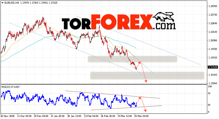 Таким образом, EUR/USD прогноз Евро Доллар на 1 апреля 2021 предполагает развитие коррекции и тест области сопротивления вблизи уровня 1.1775. Откуда стоит ожидать отскок и попытку продолжения падения пары в область ниже уровня 1.1535. В пользу снижения валютной пары выступит тест линии тренда на индикаторе относительной силы. Отменой варианта падения пары EUR/USD станет сильный рост котировок и пробой уровня 1.1895. Это укажет на пробой области сопротивления и продолжение подъёма валютной пары на Форекс в область выше уровня 1.2125.