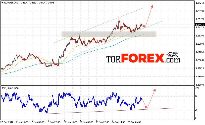 Таким образом, EUR/USD прогноз Евро Доллар на 1 февраля 2018 предполагает попытку теста нижней границы канала вблизи области 1.2410, откуда стоит ожидать отскок и попытку продолжения роста пары в область выше 1.2650, отменой варианта роста EUR/USD станет пробой уровня 1.2270, что укажет на продолжение падения пары в область ниже уровня 1.2170.
