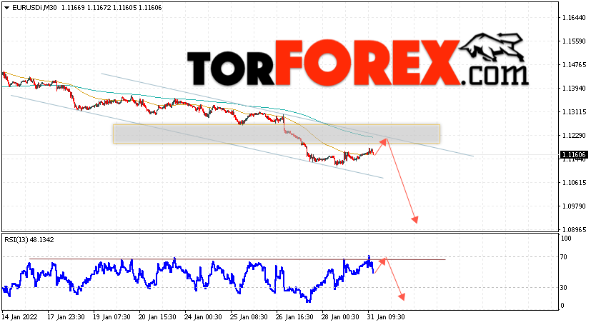Валютная пара Евро Доллар EUR/USD продолжает движение в рамках коррекции и медвежьего канала. Скользящие средние указывают на наличие краткосрочной медвежьей тенденции по паре. Цены пробили области между сигнальными линиями вниз, что указывает на давление со стороны продавцов европейской валюты и потенциальное продолжение падения котировок актива уже с текущих уровней. В момент публикации прогноза курс Евро к Доллару США составляет 1.1160. В рамках Форекс прогноза на 1 февраля 2022 стоит ожидать попытку развития подъёма цены и тест уровня сопротивления, который располагается на паре вблизи области 1.1185. Далее, отскок вниз и продолжения падения валютной пары Евро Доллар. Потенциальной целью такого движения на FOREX выступает область ниже уровня 1.0885.