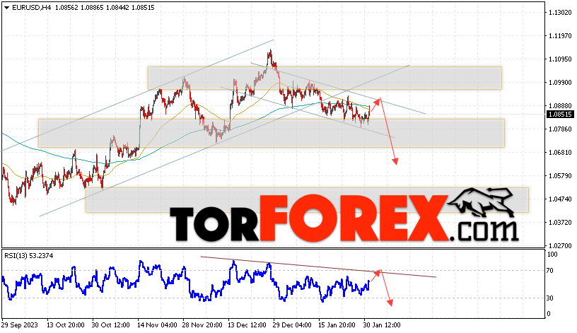 Таким образом, EUR/USD прогноз Евро Доллар на 1 февраля 2024 предполагает попытку развития бычьей коррекции пары и тест области сопротивления вблизи уровня 1.0890. Откуда стоит рассматривать отскок цены пары Евро Доллар вверх и попытку продолжения падения актива на рынке в область ниже уровня 1.0635. Дополнительным сигналом в пользу снижения инструмента на рынке Форекс выступит тест линии тренда на индикаторе относительной силы (RSI). Отменой варианта падения пары EUR/USD станет сильный рост котировок и пробой уровня 1.0975. Это укажет на пробой области сопротивления и продолжение подъёма валютной пары на Форекс в область выше уровня 1.1245.