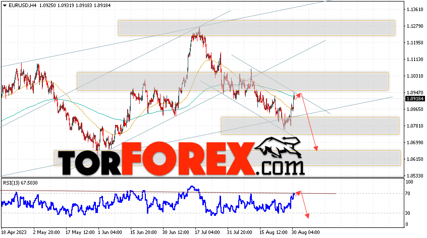 Валютная пара Евро Доллар EUR/USD продолжает движение в рамках развития сильной бычьей коррекции и нисходящего канала. Скользящие средние указывают на наличие краткосрочной медвежьей тенденции по паре. Цены вновь тестируют область между сигнальными линиями, что указывает на давление со стороны продавцов европейской валюты и потенциальное продолжение падения котировок актива уже с текущих уровней. В момент публикации прогноза курс Евро к Доллару США составляет 1.0918. В рамках Форекс прогноза на 1 сентября 2023 стоит ожидать попытку развития бычьей коррекции цены и тест уровня сопротивления, который располагается на паре EUR/USD вблизи области 1.0950. Далее, отскок цен вниз и продолжение падения валютной пары Евро Доллар. Потенциальной целью такого движения на FOREX выступает область ниже уровня 1.0635.