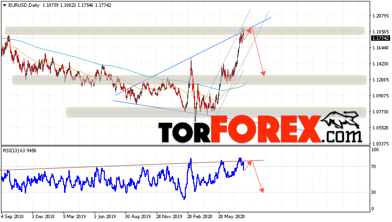 В пользу падения валютной пары EUR/USD на Форекс выступит тест линии сопротивления на индикаторе относительной силы. Вторым сигналом станет пробой нижней границы восходящего канала. Также не стоит исключать формирование модели «Расширяющаяся Формация». Отменой варианта падения котировок пары Евро Доллар на текущей торговой неделе 10 — 14 августа 2020, станет сильный рост и пробой уровня 1.2165. Это укажет на пробой области сопротивления и продолжения роста пары в область выше уровня 1.2605. С пробоем области поддержки и закрытием котировок ниже уровня 1.1505 стоит ожидать подтверждения развития медвежьего движения по паре и завершение формирования разворотной модели «Расширяющаяся Формация».