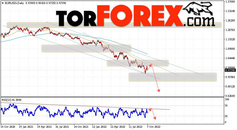 Дополнительным сигналом в пользу падения валютной пары EUR/USD на Форекс выступит тест нисходящей линии тренда на индикаторе относительной силы (RSI). Вторым сигналом станет отскок от верхней границы медвежьего канала. Отменой варианта снижения котировок пары Евро Доллар на текущей торговой неделе 10 — 14 октября 2022, станет сильный рост и пробой уровня 1.0335. Это укажет на пробой области сопротивления и продолжение роста пары в область выше уровня 1.0705. С пробоем области поддержки и закрытием котировок ниже уровня 0.9495 стоит ожидать подтверждения снижения по паре.