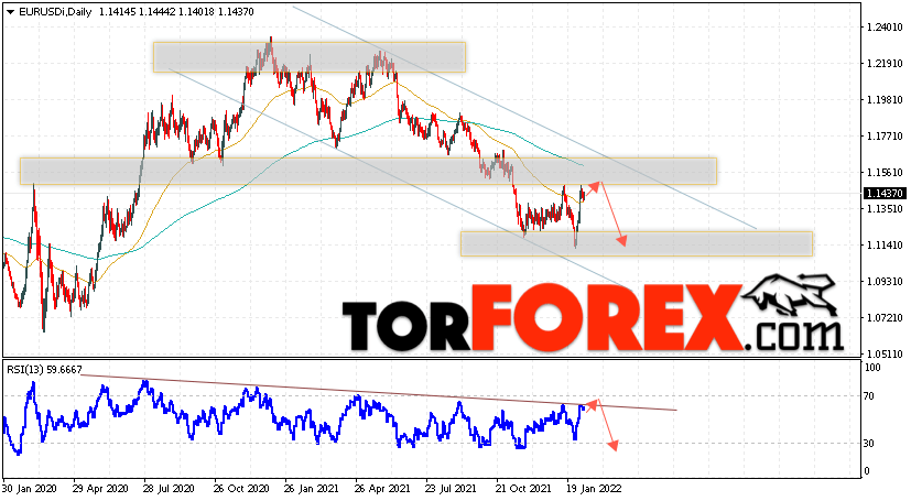 Таким образом, EUR/USD прогноз Евро Доллар на 10 февраля 2022 предполагает попытку продолжения развития бычьей коррекции и тест области сопротивления вблизи уровня 1.1455. Откуда стоит рассматривать отскок цены вниз и попытку продолжения падения валютной пары на рынке в область ниже уровня 1.1145. В пользу снижения инструмента на рынке Форекс выступит тест нисходящей линии тренда на индикаторе относительной силы (RSI). Отменой варианта падения пары EUR/USD станет сильный рост котировок и пробой уровня 1.1575. Это укажет на пробой области сопротивления и продолжение подъёма валютной пары на Форекс в область выше уровня 1.1775.