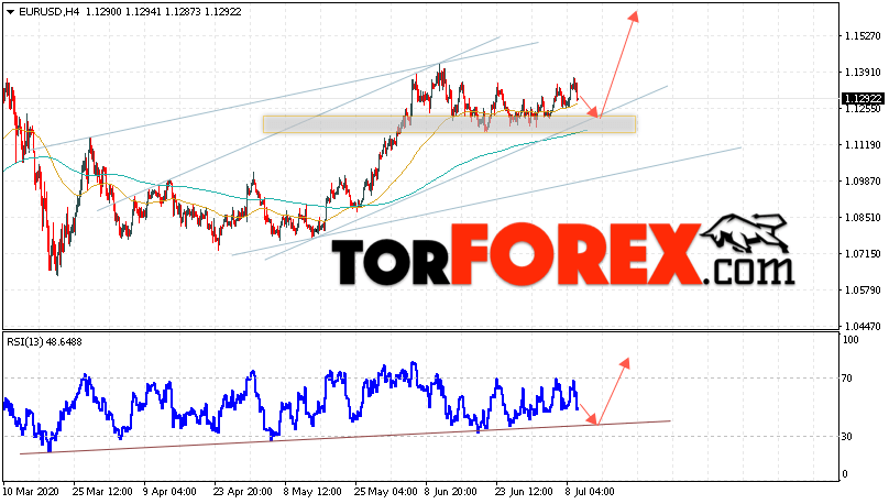 Таким образом, EUR/USD прогноз Евро Доллар на 10 июля 2020 предполагает развитие коррекции и тест области поддержки вблизи уровня 1.1285. Откуда стоит ожидать отскок и попытку продолжения роста пары в область выше уровня 1.1565. В пользу подъёма валютной пары выступит тест линии тренда на индикаторе относительной силы. Отменой варианта роста EUR/USD станет падение и пробой уровня 1.1115. Это укажет на пробой поддержки и продолжение падения валютной пары на Форекс в область ниже уровня 1.0835.