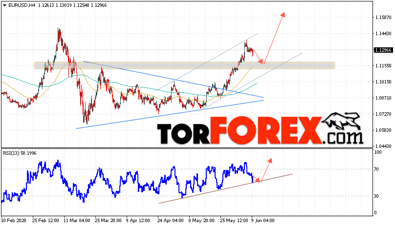 Таким образом, EUR/USD прогноз Евро Доллар на 10 июня 2020 предполагает развитие коррекции и тест области поддержки вблизи уровня 1.1165. Откуда стоит ожидать отскок и попытку продолжения роста пары в область выше уровня 1.1585. В пользу подъёма валютной пары выступит тест линии тренда на индикаторе относительной силы. Отменой варианта роста EUR/USD станет падение и пробой уровня 1.1045. Это укажет на пробой поддержки и продолжение падения валютной пары на Форекс в область ниже уровня 1.0905.