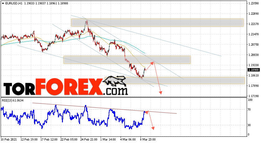 Таким образом, EUR/USD прогноз Евро Доллар на 10 марта 2021 предполагает развитие коррекции и тест области сопротивления вблизи уровня 1.1945. Откуда стоит ожидать отскок и попытку продолжения падения пары в область ниже уровня 1.1725. В пользу снижения валютной пары выступит тест линии тренда на индикаторе относительной силы. Отменой варианта падения пары EUR/USD станет сильный рост котировок и пробой уровня 1.2065. Это укажет на пробой области сопротивления и продолжение подъёма валютной пары на Форекс в область выше уровня 1.2365.