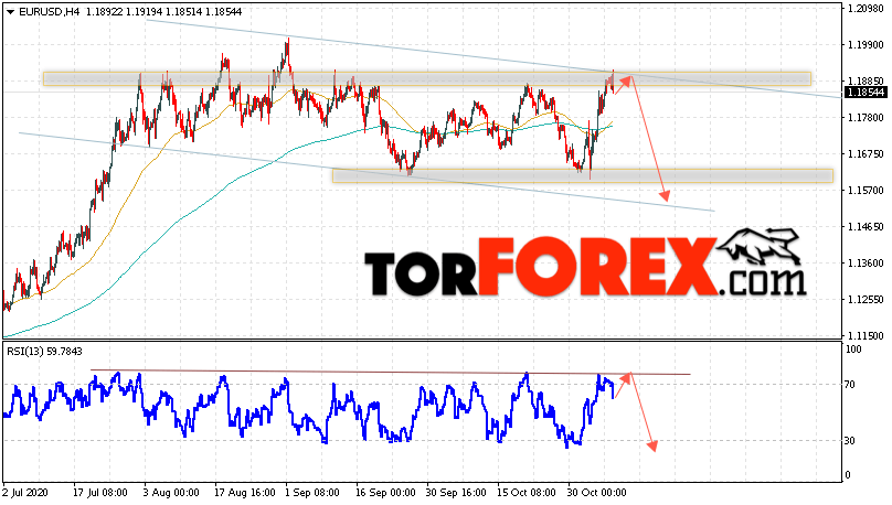 Таким образом, EUR/USD прогноз Евро Доллар на 10 ноября 2020 предполагает развитие коррекции и тест области сопротивления вблизи уровня 1.1885. Откуда стоит ожидать отскок и попытку продолжения падения пары в область ниже уровня 1.1545. В пользу снижения валютной пары выступит тест линии тренда на индикаторе относительной силы. Отменой варианта падения пары EUR/USD станет сильный рост котировок и пробой уровня 1.1965. Это укажет на пробой области сопротивления и продолжение роста валютной пары на Форекс в область выше уровня 1.2185.
