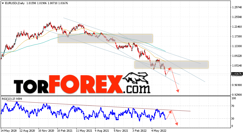 Дополнительным сигналом в пользу падения валютной пары EUR/USD на Форекс выступит тест нисходящей линии тренда на индикаторе относительной силы (RSI). Вторым сигналом станет отскок от верхней границы нисходящего канала. Отменой варианта снижения котировок пары Евро Доллар на текущей торговой неделе 11 — 15 июля 2022, станет сильный рост и пробой уровня 1.0925. Это укажет на пробой области сопротивления и продолжение роста пары в область выше уровня 1.1285. С пробоем области поддержки и закрытием котировок ниже уровня 0.9955 стоит ожидать подтверждения снижения по паре.