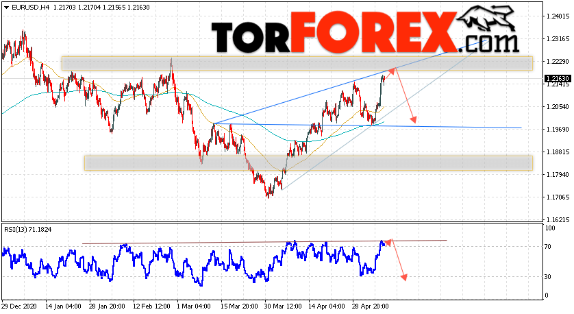Таким образом, EUR/USD прогноз Евро Доллар на 11 мая 2021 предполагает развитие коррекции и тест области сопротивления вблизи уровня 1.2185. Откуда стоит ожидать отскок и попытку продолжения падения пары в область ниже уровня 1.1975. В пользу падения валютной пары выступит тест линии тренда на индикаторе относительной силы. Отменой варианта снижения пары EUR/USD станет сильный рост котировок и пробой уровня 1.2255. Это укажет на пробой области сопротивления и продолжение подъёма валютной пары на Форекс в область выше уровня 1.2345.